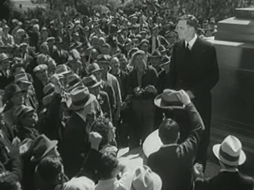 Cette situation fait sans le moindre doute référence à un événement d’ampleur survenu dans la première moitié de l’année 1932, lorsque 15 000 vétérans de guerre marchèrent sur la capitale pour exiger que leurs allocations chômage leurs soient versées. Le président d’alors, Herbert Hoover, fut incapable de faire passer une loi leur étant favorable, et n’eut d’autre choix que d’employer l’armée en service pour évacuer les manifestants, sous la pression de la classe politique. Hearst, qui était de tout cœur avec les vétérans, fut l’un des rares critiques à l’égard de cette décision, qu’il qualifia de stupidité outrancière. Dans le film, cependant, Hammond n’emploie aucune force face aux citoyens mécontents (il destitue même un secrétaire d’état – celui à qui il doit en partie le financement de sa campagne – car celui-ci veut envoyer l’armée), mais parvient à un accord avec eux, adoptant une position populiste et massivement interventionniste, assimilant de ce fait la politique de Hoover à une incompétence crasse. On notera également que le film présente une foule de manifestants ordonnée, civilisée et aux réclamations légitimes (point surligné par le fait qu’ils exigent du travail et non de l’argent), ramenée à l’ordre par le seul pouvoir rhétorique du président qui vient les rencontrer avant même qu’ils n’arrivent à Washington, comme pour louer à la fois les hauts faits de ce dernier et la contenance fière et mesurée du peuple.