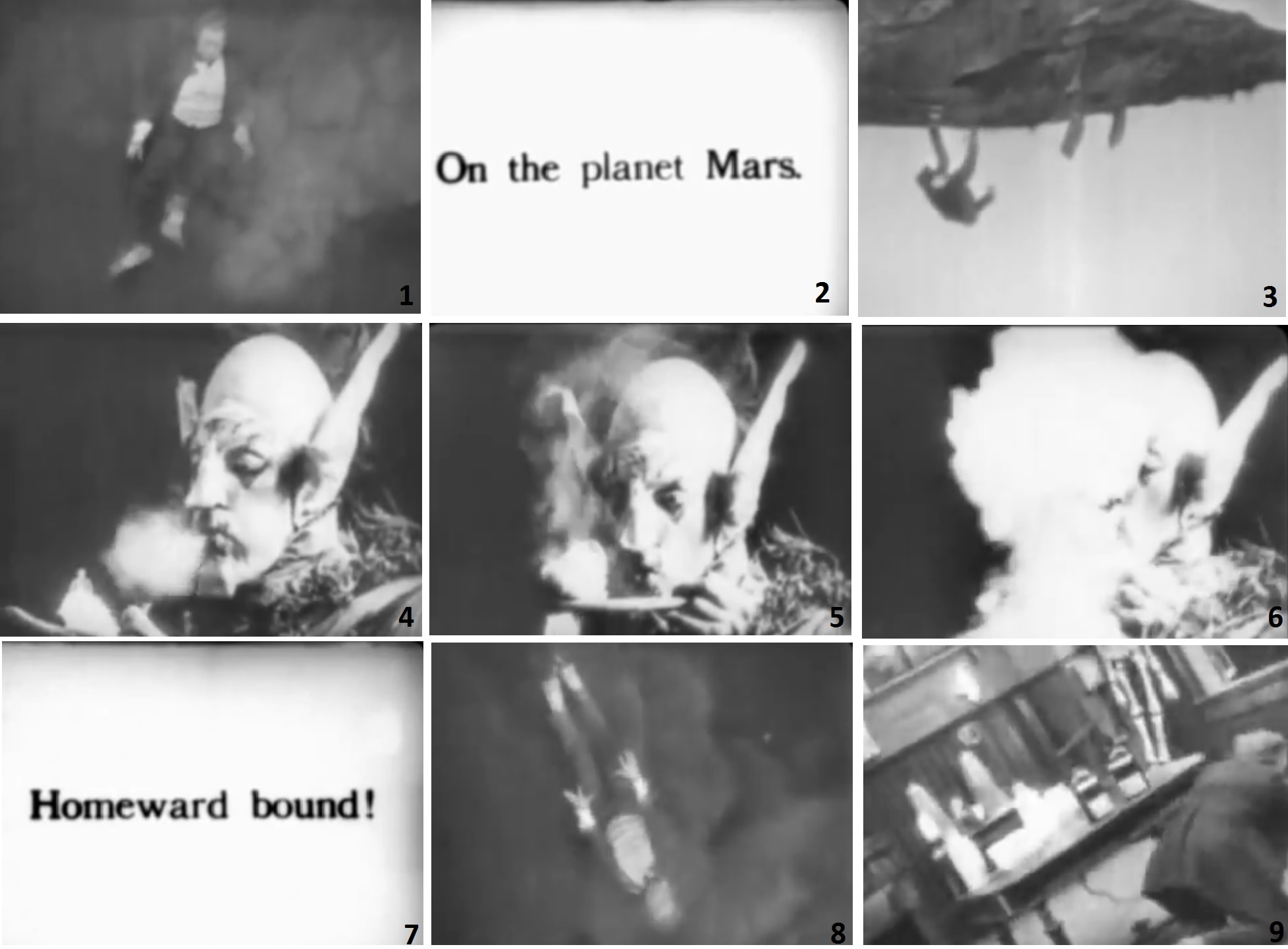Il aura fallu attendre huit ans après le fameux Voyage dans la Lune de Georges Méliès pour voir un cinéaste étendre l’exploration cinématographique de notre système solaire à un autre de ses corps célestes. Sous la houlette de Thomas Edison, Ashley Miller réalise le court-métrage A Trip To Mars en 1910, pensé et construit comme une réponse à Méliès. En à peine cinq minutes, le film raconte le voyage sur Mars d’un scientifique qui découvre un produit capable d’inverser les lois de la gravité. Après avoir fait s’envoler plusieurs objets dans son bureau, l’homme verse sur lui deux récipients pleins de sa poudre magique. Le voilà donc qui s’envole, sur un fond noir (fig.1). Quelques secondes plus tard, un carton nous apprend que nous sommes désormais sur la planète Mars (fig.2). Nous y retrouvons notre scientifique, marchant sur un rocher la tête à l’envers afin de nous rappeler que c’est grâce à une inversion des lois de la gravité qu’il a pu rejoindre la planète (fig.3). Il s’agirait donc de la toute première représentation de la planète rouge au cinéma. Le plan suivant montre l’homme au milieu d’une forêt d’arbres vivants à l’allure terrifiante. Il tente de fuir et se retrouve dans la main d’un géant qui le congèle grâce à son souffle (fig.4). Maintenant emprisonné dans une boule de neige, le scientifique se voit placé sur des flammes par le géant (fig.5), ce qui provoque une explosion qui éjecte le savant (fig.6), lui permettant de rejoindre la Terre (fig. 7 et 8). De retour dans son bureau, terrifié par son expérience, l’homme décide de jeter les récipients contenant la poudre capable d’inverser les lois de la gravité. C’est alors que toute sa maison se renverse et finit par s’envoler (fig.9). A Trip To Mars se termine avec un dernier plan où la caméra tourne sur un axe fixe, donnant l’impression que la maison effectue des tonneaux dans l’espace.