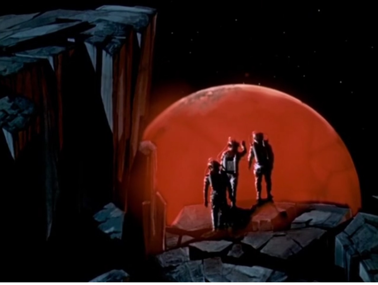 Au final, ni les Soviétiques ni les Américains ne fouleront le sol de Mars dans Nebo Zovyot, les Russes ayant sacrifié leur mission – et risqué leur vie – pour aller secourir l’équipage américain. La représentation qui est faite de Mars n’est, par conséquent, que lointaine. Mais l’astéroïde sur lequel les astronautes ont atterri en urgence est l’occasion de superbes vues éloignées de la planète (voir ci-dessus). Ainsi, cet échec (qui frustre autant les personnages que le spectateur) est reçu comme une leçon « cruelle mais enrichissante au sujet de [la] compétition inutile » dans laquelle se sont lancés les deux blocs, comme le souligne ce dernier dialogue récité face caméra. Cette idée de coopération entre deux antagonismes politiques pour secourir des astronautes américains sera d’ailleurs reprise dans Seul sur Mars (Ridley Scott, 2015).