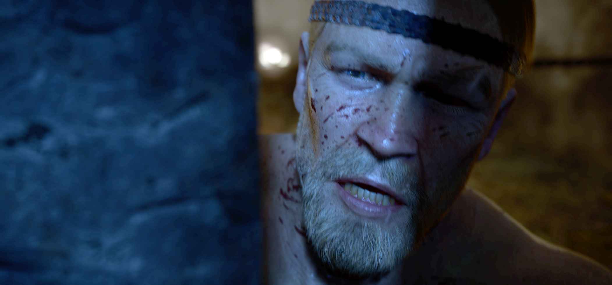Tout est posé à l’arrivée des Goths chez Hrothgar, lorsque le héros raconte son combat homérique contre des monstres marins. Le perfide Hunferth mettant en doute la véracité de l’événement, l’orgueilleux guerrier se lance dans le récit de cet épisode. Peu à peu, l’on remarque que les images qui nous sont montrées ne correspondent pas tout à fait à ce qu’affirme Beowulf. Jusqu’au dernier plan, dans lequel il enlace la sirène plutôt que de lui plonger sa lame en plein cœur, qui contredit définitivement la narration en voix-over et authentifie donc le flash-back visuel comme vrai. De même, la scène annonce déjà la propension du héros à céder face à une tentatrice aquatique et à mentir ensuite en affirmant avoir « tué le monstre ». Comme le chuchote Wiglaf à un soldat, Beowulf modifie son récit d’une fois à l’autre, augmentant par exemple le nombre de monstres affrontés. En se racontant lui-même, il façonne ainsi son personnage et écrit sa propre légende.