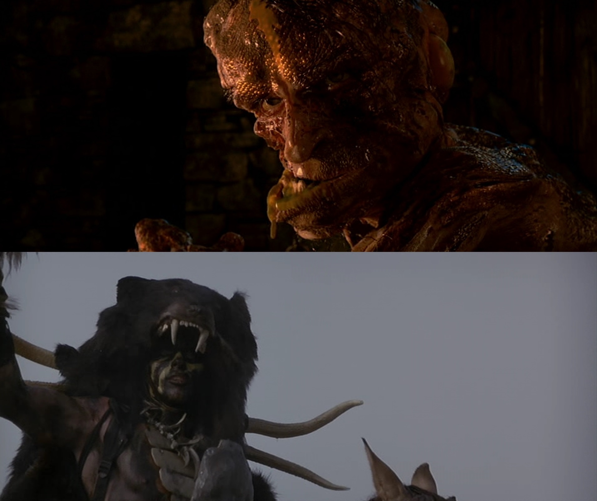 Le 13e Guerrier comme La Légende de Beowulf jouent de cette confusion entre l’humain et le monstre, entre le héros et ses adversaires. Dans le film de McTiernan, ce sont les Wendols qui se déguisent en ours. Lors de la sublime séquence d’affrontement nocturne contre le « dragon », vikings et sauvages se mélangent dans l’obscurité pour finir par se confondre. Chez Zemeckis, les monstres naissent du mensonge des Hommes et deviennent l’expression de leur culpabilité. Grendel est la malédiction de Hrothgar, le dragon est celle de Beowulf. Logiquement, l’acteur Ray Winstone, qui incarne Beowulf, prête également ses traits au dragon. De plus, le fameux récit du combat en mer met déjà sur la piste : tandis que Beowulf affirme que « les monstres attaquaient encore et encore », à l’image c’est lui qui poignarde à répétition les créatures… Ce n’est qu’en acceptant sa propre part de monstruosité que le héros pourra définitivement « vaincre ses démons » : pour triompher du dragon, il n’a d’autre choix que de se trancher le bras gauche, soit le même qu’il avait arraché à Grendel.