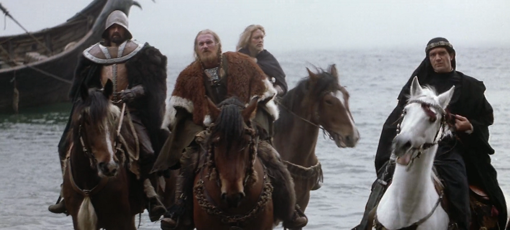 Quelques années plus tard, le Royaume-Uni et la Yougoslavie coproduisent Les Drakkars (The Long Ships ; Jack Cardiff ; 1964), une adaptation très libre d’un roman d’aventure suédois populaire. Dans cette histoire, un groupe de Vikings renégats et un prince maure s’engagent dans une course au trésor pour retrouver un artefact d’une valeur inestimable. Bien que le métrage soit globalement considéré comme un échec (un film de cape et d’épée manqué), il parvient à retenir en filigrane quelques problématiques abordées par le livre d’origine, notamment en termes d’opposition des cultures. Ainsi, les affrontements continus entre les Danois et les Maures s’apparentent bien vite à une mise en parallèle des systèmes culturels, avec les Occidentaux d’un côté et les Orientaux de l’autre. Le film reste toutefois ambigu dès qu’il s’agit de déterminer quelle culture représente l’idée de civilisation, et quelle culture s’apparente au barbarisme. Ainsi, comme l’explique Donald L. Hoffman dans le recueil The Vikings on Film: Essays on Depictions of the Nordic Middle Ages : « Dès lors que l’on réalise que le barbarisme et la civilisation s’appuient de manière égale sur des fondements de cruauté, ce n’est plus vers des valeurs mais vers l’empathie qu’il convient de se tourner ; et pour accepter une culture, il ne s’agit plus de déterminer laquelle est la meilleure, seulement de savoir à laquelle on appartient. » Le film se conclut bien logiquement comme il s’ouvre : le regard fixé sur les aventures à venir. Produit pour profiter du succès du blockbuster de Fleischer (sur lequel Cardiff était directeur de la photographie), Les Drakkars se veut tout aussi romanesque, mais échoue malheureusement à insuffler un véritable souffle au récit. Il n’en reste pas moins important en cela qu’il perpétue les légendes d’exploration de la société viking, les faisant voyager par-delà les mers pour découvrir les plus grands trésors de l’humanité.