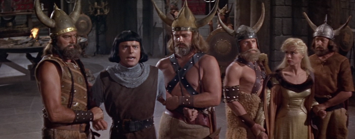 Aussi surprenant cela puisse-t-il paraître, le premier long-métrage explicitement viking produit aux États-Unis et faisant suite tardive au pionnier The Viking (Roy William Neill ; 1928) est une réalisation de Roger Corman ! Alors que l’homme est connu pour suivre les tendances et inonder le marché de séries B afin de profiter des modes, Corman se révèle ici clairvoyant et devance ses concurrents (même les Italiens, c’est dire) en sortant le film d’exploitation The Saga of the Viking Women and Their Voyage to the Waters of the Great Sea Serpent en 1957. Dans celui-ci, les femmes vikings ne voyant pas leurs hommes revenir de la chasse décident de partir à leur recherche. Leur bateau échoue sur les rives d’un royaume ennemi, dirigé par un roi mégalomaniaque qui retient les hommes vikings prisonniers. Une fois libérés, ces derniers rentrent au pays avec leurs femmes, non sans rencontrer le fameux serpent des mers sur leur passage. Outre la production value abyssale, les interprétations involontairement comiques et les plages californiennes utilisées comme de supposés fjords, le film de Corman a sans doute le mérite de réintroduire l’idée des Vikings dans la culture cinématographique après plusieurs décennies, bien qu’il ne s’intéresse pas vraiment au folklore scandinave. Le film constitue surtout une occasion de faire parader des femmes guerrières peu vêtues devant la caméra (parfois avec des lunettes de soleil, pourquoi pas) dans le style des « films d’Amazones » alors très répandus. Il s’agit aussi d’une des rares instances du corpus à faire des femmes les têtes d’affiche (ici en inversant le poncif de la demoiselle en détresse), ce qui peut participer à l’idée reçue selon laquelle les femmes profitaient de privilèges équivalents aux hommes en Scandinavie médiévale. Or, si cette société était effectivement plus progressiste que d’autres sur certains points (droit de divorce sous certaines conditions, droit de prendre part au combat), la société viking demeurait fondamentalement patriarcale. Cela étant, la mise en avant des femmes chez Corman ne représente qu’un écran de fumée, car aucun personnage du film n’envisage qu’une société matriarcale puisse subsister, ni même exister.