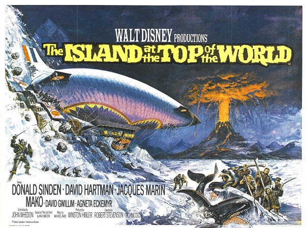 Dès lors, les Vikings n’ont jamais vraiment quitté la conscience populaire occidentale, et ils finiront évidemment par donner lieu à un important corpus cinématographique. Un parfait exemple de la persistance de cette fascination aux ramifications victoriennes se retrouve jusque dans le film L’Île sur le toit du monde (Robert Stevenson ; 1974), une production Disney se déroulant au début du XXe siècle, dans laquelle un aristocrate britannique organise une expédition vers les régions arctiques pour retrouver son fils disparu. Il emploie à cette fin les services d’un archéologue de descendance scandinave et d’un inventeur français acceptant d’affréter son dirigeable steampunk, l’Hyperion. Leur aventure les mène à la découverte d’une colonie insulaire viking ayant évolué en autarcie totale depuis des centaines d’années, dont les habitants ne s’expriment qu’en vieux norrois ! Les fantasmes de projection de l’imaginaire collectif se retrouvent ici réunis pour proposer une représentation hautement iconique des Vikings et de leurs rapports avec la civilisation moderne, du paganisme ésotérique (en atteste la présence du godi antagoniste) aux tuniques et casques anachroniques, en passant par leur capacité de rédemption et d’ouverture vers un possible salut post-apocalyptique (l’ultime dialogue posant l’île secrète d’Astragard comme potentiel refuge futur pour l’humanité).