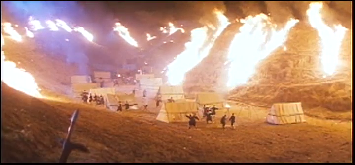 Le point de non-retour entre historicité et fiction s’effectue à la fin de la première partie, lors du spectaculaire incendie du palais impérial Qin. Au cours de cette scène, le romantisme, le romanesque et le mélodrame convergent pour transformer définitivement le protagoniste en héros tragique. L’embrasement du palais est alors expliqué par le profond désarroi ressenti par Xiang Yu lorsqu’il apprend que Yu Miaoyi a probablement péri aux mains des Qin. Fou de rage, il brûle leur demeure, avant de se rendre compte que sa concubine est toujours retenue prisonnière au sous-sol et de braver les flammes pour la secourir. Il se trouve néanmoins que la version officielle est tout à fait différente, et que Xiang Yu n’était à peu de choses près qu’une sombre ordure :