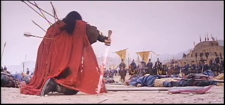 Dans sa scène finale, le film semble gagner une nouvelle dimension : la caméra, affranchie de toutes contraintes naturalistes, se libère. Elle prend enfin le temps de s’arrêter sur son protagoniste, de souligner ses émotions, de l’iconiser, tandis que la chorégraphie de l’ultime combat change radicalement des précédentes pour devenir opératique, glorifiant les mouvements rotatifs amples et les pas de danse martiale millimétrés pour proposer une démonstration finale à la fois cinétique et cinématographique, épousant enfin les formes du film d’arts martiaux descendant de l’opéra chinois. Les archers qui viennent mettre fin à sa charge ne sont appelés que parce que l’affrontement physique direct est insuffisant. Xiang commande le mouvement des soldats à chacun de ses pas mais s’effondre sous le coup lâche des flèches lancées grossièrement. Son sort est mis en parallèle avec celui d’un assassin essayant de tuer l’empereur Qin au tout début du film : deux guerriers défendant leurs idéaux jusqu’à la mort pour combattre la tyrannie. Enfin, les paroles de la chanson mélancolique qui clôture le film demandent pourquoi (ou plutôt les Hongkongais et les Chinois) ne peuvent pas coexister parallèlement, et affirment que le « conquérant de l’Ouest » vivra à jamais dans la postérité (au même titre que Hong Kong). Il dit avoir vécu en héros et vouloir mourir en héros, mais ne meurt pas pour autant en martyr, en atteste son suicide symbolique final qui fait s’éteindre sa cause avec lui.
