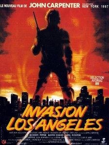 Carpenter continue sur sa lancée avec un autre film à petit budget, la dystopie de catch anti-establishment au splendide titre français Invasion Los Angeles ! Le poster américain, devenu culte, repose sur l’excellente idée de superposition des niveaux de réalité, en opposant la vision extérieure du protagoniste à celle que procurent les lunettes. Cela n’a bien entendu aucun sens logique ou physique, mais le résultat fait un carton. On vous promet rien de moins que de vous ouvrir les yeux. Vous avez dit thriller conspirationniste ?