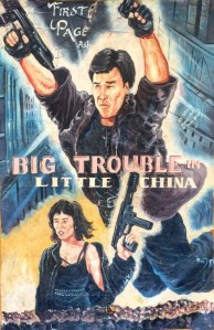 La trilogie Jack Burton ghanéenne vaut quant à elle son pesant de cacahouètes, non seulement parce que la ressemblance physique de ces dessins aux acteurs est discutable, mais aussi parce Kurt Russell ne semble pas toujours y occuper le haut de l’affiche, celle-ci étant dominée par Lo Pan d’un côté et Wong de l’autre. Est-ce à dire que voir des Chinois excitait plus le public ghanéen, peut-être fan inconditionnel de Jackie Chan ? Fort peu probable, mais les artistes derrière ces dessins n’avaient sans doute qu’assez peu d’images de référence.