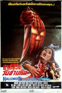 Le fameux slasher de John Carpenter est son premier métrage ayant fait l’objet d’une vraie ébullition en terme de marketing. S’étant forgé un petit nom grâce à Assaut, Big John enchaîne donc avec le film d’horreur le plus populaire et rentable de tous les temps à l’époque (et il le restera jusqu’à la fin du siècle). Les affiches américaines d’Halloween demeurent à ce jour très connues, et partagent toutes des caractéristiques communes, comme la mise en valeur de l’arme blanche et du masque. Ce dernier est même amalgamé de façon habile avec une citrouille sur le premier, formant une imagerie inquiétante et fantasmagorique qui rappelle celle de La Baie sanglante de Mario Bava, ou nombre de giallos l’ayant précédé. Ces éléments deviendront par la suite des normes du genre que la plupart des équipes marketing concernées se feront un plaisir de suivre à la lettre. On remarque que dans chaque cas, le visage inexpressif de Michael Myers trouve un moyen de surplomber la scène, attirant inexorablement le regard.