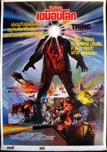 Le poster thaïlandais, magnifiquement composé et colorisé (comme souvent), combine les idées des affiches originelles tout en augmentant sans surprise le niveau de gore. Les entrailles du second poster américain se retrouvent donc dans la silhouette inspirée du premier, tandis que diverses tentacules et chiens habités viennent parfaire ce panorama des délices attendant le public. L’Espagne quant à elle reste assez proche du second poster américain, bien que se permettant d’être plus minimaliste dans la partie inférieure de l’image. Côté allemand, on ne s’est toujours pas repris, puisque cet affreux montage place MacReady face à un ramassis de rouge informe, qu’il est impossible d’identifier pour le chaland.