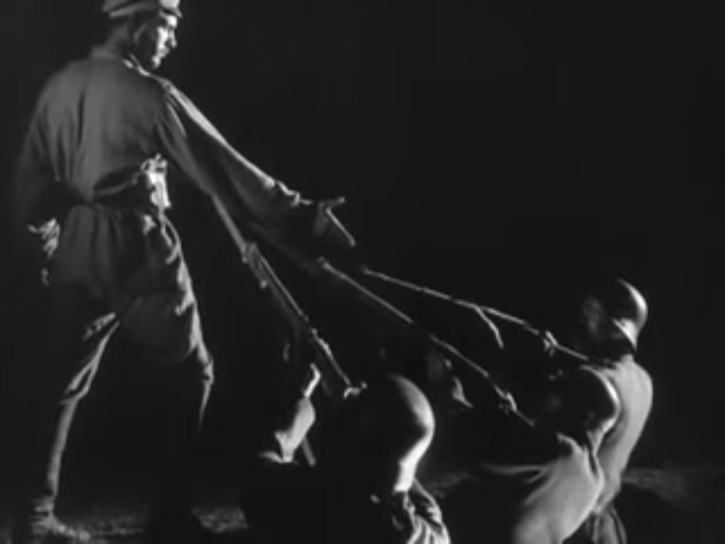 Cette éternalité ukrainienne se retrouve également dans la dimension hautement symbolique du film, qui dresse d’innombrables parallèles entre passé et présent, en faisant jouer plusieurs rôles différents à de mêmes acteurs (le vieillard joue le rôle d’un Cosaque, du grand-père et d’un frêle général d’armée, tandis que la jeune paysanne Oksanna est interprétée par la même actrice que la légendaire reine Roksanna). Nulle surprise donc, d’observer qu’un cinéaste obsédé à la fois par la tradition et la révolution représente les mythes du folklore et la naissance du communisme (le film sort pour les dix ans de la révolution d’Octobre) à travers des images iconiques, combinées à des effets cinématographiques encore expérimentaux. Ainsi, les arrêts sur image traduisent les bonds temporels, tandis que les montages accélérés et fondus permettent de créer des symboliques puissantes, et que le récit de l’invasion viking est enjolivé de superpositions élevant ce passage à un statut mythologique. La problématique l’accompagnera encore sur plusieurs de ses films, quoi que de façon moins ouvertement identifiable.