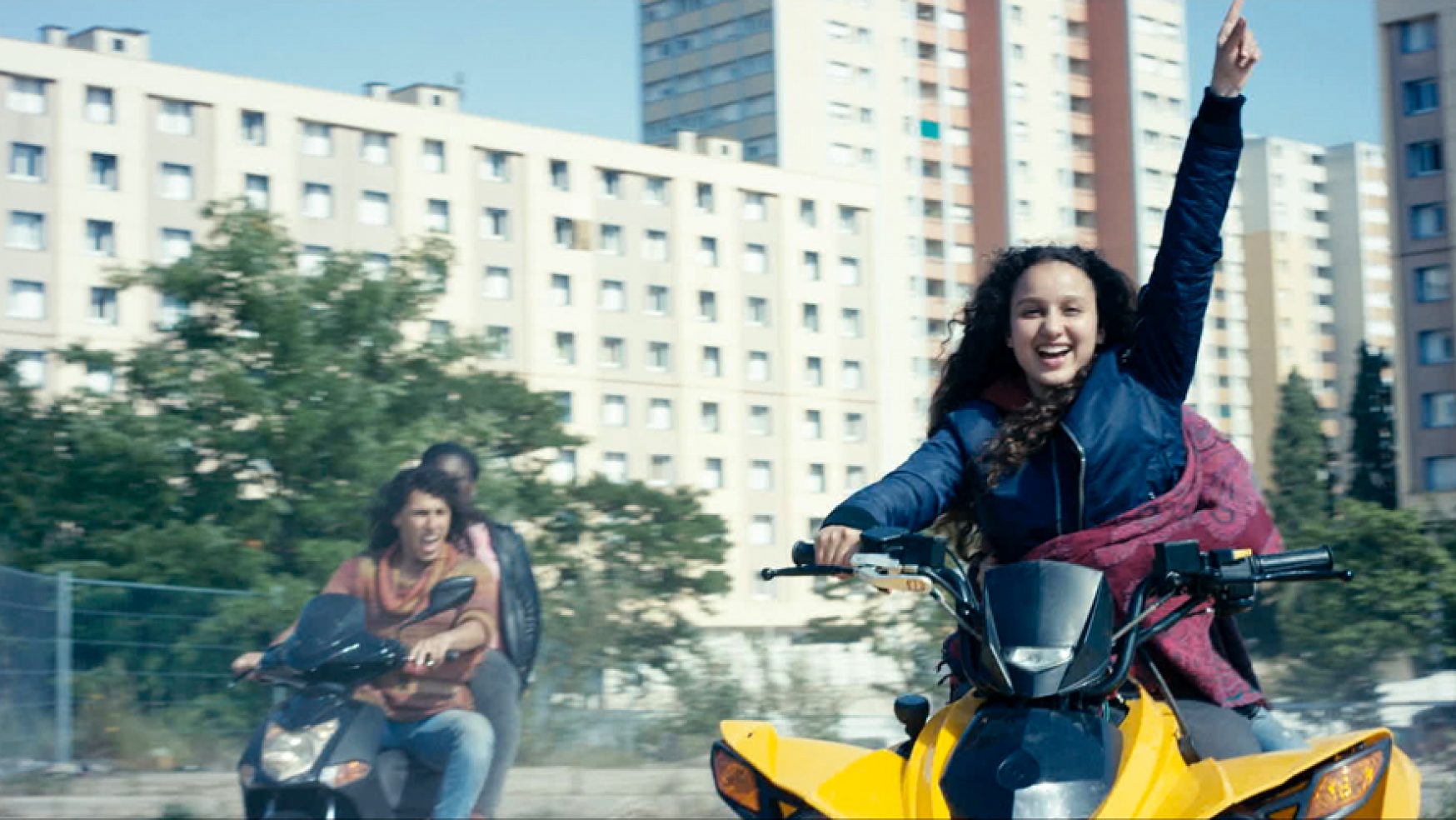 Engluée dans cet horizon bouché, Dounia va peu à peu quitter terre pour s’élever toujours plus haut, gravissant les échelons à double tranchant de sa destinée. Entre ces deux niveaux de perception, le film prend de l’ampleur et décolle littéralement, à l’instar de cette scène où Dounia et Maimouna, en train de « crevarder » au pied d’une tour les poches pleines de drogue et d’argent, s’imaginent à Phuket au volant d’une Ferrari, une paire de Ray-ban sur la tête et un cocktail à la main. Avec un orteil qui traîne encore dans l’enfance, les deux jeunes filles se laissent complètement aller à leur fantasme, enclenchent l’autoradio, prennent un virage à droite, mettent les gommes et freinent brusquement pour trinquer à leur bonheur. En coulisses, Benyamina joue le jeu de ses personnages. Les filles roulent littéralement dans le plan, tandis que la cinéaste bruite leurs actions pour matérialiser ce monde imaginaire qui s’ouvre à elle, offrant au film l’une de ses plus belles séquences, une parenthèse fantastique qui permet une respiration nécessaire.