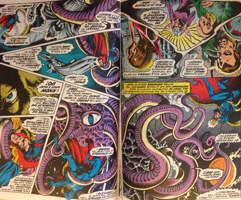 Que le syncrétisme de DeMatteis se révèle trop avancé pour les objectifs commerciaux de Marvel, soit, mais la riche histoire du personnage offre d’autres possibilités qui auraient aisément permis de transformer l’essai en aventure à la thématique beaucoup plus étendue. Quid de l’époque Engelhart-Brunner, au début des années 1970, durant laquelle Strange est sauvé in extremis des tréfonds de la banalité super-héroïque (le héros avait été affublé d’un masque et d’une identité secrète, Stephen Sanders) par le biais d’un arc à l’incroyable immensité théologique ? Celle-ci s’étendait de la lutte face à l’entité primordiale Shuma-Gorath à l’affrontement de la personnification cosmique de la mort, en passant par la remontée du temps jusqu’à l’origine de la création aux mains du sorcier Sise-neg supplantant Dieu lui-même ! D’une portée jamais égalée depuis, et seul capable de tenir tête aux innovations formelles de Ditko, cet arc bénéficie d’une mise en page se payant le luxe d’être plus cinématographique que le film, en cela que sa narration exploite de manière bien plus sophistiquée les possibilités offertes par le médium en termes de dynamisme et d’engagement du public. Loin du prosaïsme choisi par Marvel Studios (certes amusant mais finalement assez peu stimulant), Engelhart et Brunner brouillent les pistes de lecture en plongeant le lecteur dans un tourbillon d’images et d’idées l’obligeant à suivre activement l’aventure notionnelle illustrée. Les entités lovecraftiennes invoquées par ces comics auraient par ailleurs pu parfaitement seoir à un réalisateur habitué aux films d’horreur comme Derrickson, qui aurait alors ouvert les portes du fantasmagorique et pu faire appel à des abstractions horrifiques rarement abordées au cinéma, notamment par des cinéastes comme John Carpenter ou Lucio Fulci. Bref, le réalisateur pouvait choisir de s’inspirer d’histoires parmi les plus brillamment conçues dans les comics mainstream mais a préféré s’en tenir à la récupération d’une idée satellite de piètre importance (le livre de Cagliostro et son sort temporel), aux clins d’œil vides de sens et aux recréations de scènes manquant terriblement d’imagination en comparaison (comme celle de l’entraînement avec Mordo, qui rappelle l’horrible film d’animation de 2007, ou celle de l’opération dans The Oath de Brian K. Vaughan et Marcos Martin).