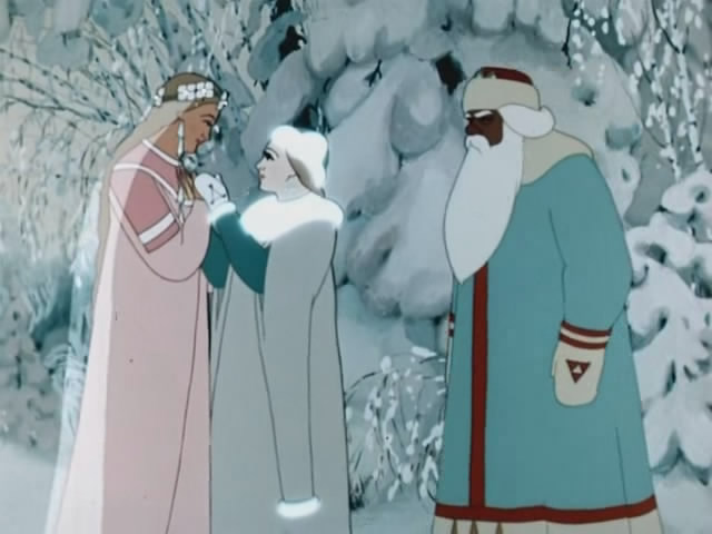 Ainsi, la fascination du compositeur russe pour l’antiquité peut être pleinement appréhendée par l’équipe en charge de son adaptation. La réalisation est notamment confiée à Ivan Ivanov-Vano, doyen de l’animation soviétique qui reliera d’un trait assuré les recherches stylistiques des années 1920 au cinéma d’auteur de la fin du régime. Celui qui finira par être surnommé le Disney russe rejoint officiellement le Parti communiste en 1951 et se charge ainsi d’assurer la viabilité idéologique de toutes les productions qu’il supervise. Difficile d’exagérer l’influence qu’il exercer sur l’art animé soviétique : né en 1900 dans une famille modeste, il rejoint l’industrie dès 1923 et fait très vite ses preuves en tant que visionnaire, avec des travaux tels que Katok (The Skating Ring ; 1927), Blek end Uajt (Black & White ; 1932) ou encore Skazka O Care Durundae (Tale about Tsar Durundai ; 1934). Ce dernier film, mis en parallèle de Snegurochka, illustre parfaitement l’évolution de l’acceptation des traditions anciennes au sein du pays. Giannalberto Bendazzi observe, dans le 2e volume de son ouvrage encyclopédique Animation: A World History, que « cette première immersion dans les tréfonds du véritable folklore russe, alliée à un style peu conventionnel, constituait une satire de l’ère tsariste. »