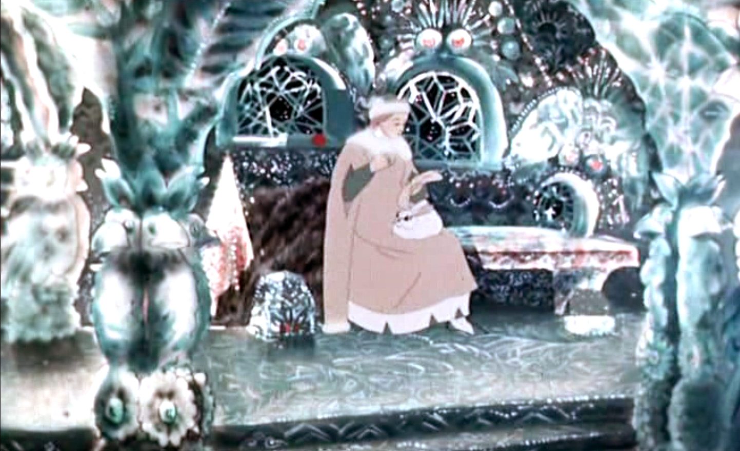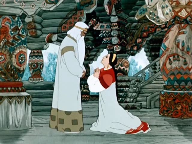 Le style adopté donne lieu à des décors aux compositions saisissantes, laissant la part belle aux paysages enneigés, aux forêts denses et à une architecture tsariste transposant le Palais des Térems à l’âge préchrétien. La sobriété des mouvements invite d’autant plus à admirer ce travail que le film vit avant tout d’un hypnotisme rendu possible par ses textures d’arrière-plan riches, qui s’approchent par moments d’aquarelles. Moins importante que l’atmosphère de célébration véhiculée, l’intrigue elle-même renferme toutefois des éléments qu’il convient de relever, et notamment dans sa représentation d’un passé idyllique, dans lequel l’infidélité est réprimandée par le Tsar en personne et où la nature et l’amour jouent un rôle central dans la vie des hommes et des femmes.