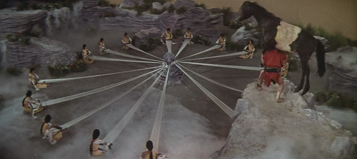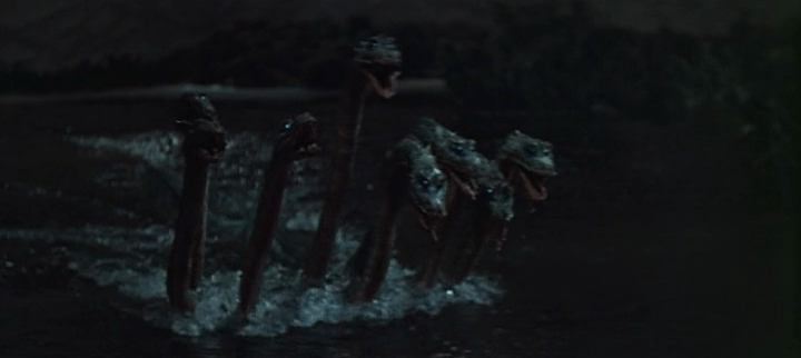 L’immense Toshiro Mifune interprète à la fois le dieu Susanoo et son descendant le prince dynastique. Tourné en « Tohoscope », la version régionale du CinemaScope, le film bénéficie d’une photographie inégalée lors de sa sortie, et magnifie à l’extrême les impressionnants paysages nationaux. Ambitieux, le long-métrage revêt une portée littéraire et une importance symbolique appuyées, donnant vie comme jamais à plusieurs épisodes de la genèse mythologique shintoïste. Désireux de bien faire, les producteurs de la Toho chargent l’irremplaçable Eiji Tsuburaya, qu’on ne présente plus, de s’occuper des effets spéciaux. Son équipe réalise de nombreux tours de force, parmi lesquels un duel hypnotique entre Susanoo et le dragon à huit têtes Yamata-no-Orochi. Cette séquence d’anthologie, qui fait réaliser un bon en avant à l’industrie japonaise, est notamment suivie d’une tempête maritime destructrice et de l’éruption saisissante du mont Fuji, puis du tsunami subséquent – symboles de la destruction naturelle, du nettoyage inévitable des parasites corrompant la civilisation nippone, qui sera suivi d’une renaissance quasi-totale du monde (tiens, tiens…). Comme expliqué par August Ragone dans l’ouvrage Eiji Tsuburaya: Master of Monsters, l’évolution des techniques permises par Tsuburaya doit énormément à son « processus Toho versatile », une réinvention radicale du procédé d’impression optique du studio, conçue pour optimiser la projection de films couleurs au format large.