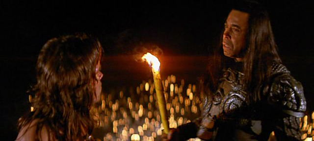 Retour sur le droit chemin avec le morceau Meeting Valeria/Stealing the Eye (ou Hopefuls At The Tower of Set), qui marque la rencontre fatidique entre les deux guerriers. Il est alors intéressant, même si peu étonnant, de remarquer que cette scène charnière entre deux étapes de la vie du protagoniste est avare en accompagnements musicaux, seuls des bois graves et distants se faisant entendre parmi les bruits intra-diégétiques difficilement identifiables. Ces bois ouvrent progressivement la porte à une mélodie folklorique jouée sur des instruments traditionnels qui donnent une saveur exotique aux sonorités, augmentés de chœurs très discrets (on retrouve aujourd’hui des sons forts similaires dans certains morceaux du groupe Wardruna). Celles-ci marquent non seulement l’altérité régnant dans la tour de Set, mais fonctionnent surtout comme un accompagnement à la procession du culte du serpent. Le fait que le duel entre Conan et l’immense serpent gardant le trésor se joue en montage alterné sur la même musique signale que les deux événements ont une teneur ritualiste identique : le sacrifice religieux de la jeune femme et l’occision du monstre relèvent de la même logique initiatique et codifiée. La cyclicité envoûtante du score appelle donc directement le montage à mettre les deux scènes en parallèle et leur octroie leur valeur symbolique.