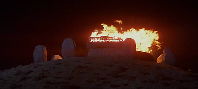 Cela donne lieu à l’un des plus beaux morceaux du score, à savoir The Leaving/The Search. La première moitié, plaintive, augmente la dimension mélancolique du thème Wifeing tout en s’inscrivant comme une extension organique de la piste Atlantean Sword (les deux pourraient sans mal être jouées à la suite). Une tension similaire réside en leur cœur, Conan devant ici choisir de rester avec Valeria et de vivre heureux ou de répondre à l’appel de l’aventure en partant (comme il répondait à l’appel de la force ancestrale lors de sa découverte de l’épée). Dès lors que l’image transitionne vers un montage de Conan arpentant les plaines et les vallées à la recherche du culte, l’orchestre s’envole, se cherche, jusqu’à déboucher sur une interprétation toute puissante de la gamme thématique du protagoniste pour louer les grandes étendues, la quête ultime… l’explosion musicale héroïque. Claudia Gorbman, évoquant une scène à la construction similaire (plans larges de chevauchée, paysages immenses, absence de dialogues, musique écrasante), expliquait :