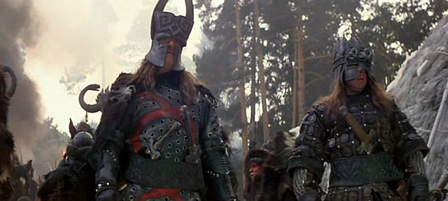 Riders of Doom s’impose par conséquent comme un descendant du morceau Battle on the Ice de Prokofiev. Dans celui-ci, les chœurs religieux sont augmentés d’une marche militaire appelant à l’affrontement imminent, et écrasent par leur puissance tous les autres sons, dialogues compris. Il s’agit d’une belle synthèse de la théorie du montage vertical d’Eisenstein, superbement ravivée par les images de Milius et la musique de Poledouris dans Conan. Cette résurrection musicale est accompagnée d’une identité visuelle similaire chez les guerriers de Thulsa Doom et les Allemands belliqueux du film russe (cavaliers équipés d’armes menaçantes et casques à cornes énormes et intimidants). Loin de se contenter d’imiter, le tandem américain introduit cependant des différences majeures. La première tient du fait que la noblesse des chevaliers d’Eisenstein est supplantée par une frénésie brutale et primitive. La seconde découle de celle-ci : alors que la musique s’arrêtait lorsque commençait vraiment la mêlée dans Alexander Nevsky, elle continue dans Conan. En effet, dans le premier cas, les Russes se défendaient et l’affrontement visuel prenait ensuite le pas sur la démonstration opératique. Or Milius prolonge ici le raz-de-marée musical déferlant sur le village car ses habitants n’opposent aucune résistance notable. C’est la victoire inconditionnelle de l’action sur l’inaction, de la tragédie sur la tranquillité, du barbare sur le civilisé, du processus de création des légendes sur l’endormissement sociétal venant avec la paix. La musique de Prokofiev cessait car les deux armées se valaient en puissance. L’opéra articulant la grande bataille se taisait pour montrer la légende (déjà existante et bien connue), alors que chez Poledouris, l’opéra continue car il commence seulement à conter cette légende.