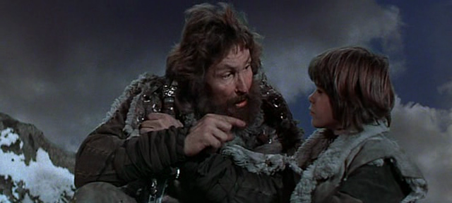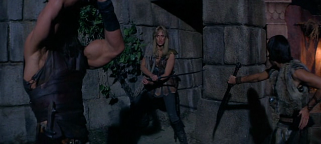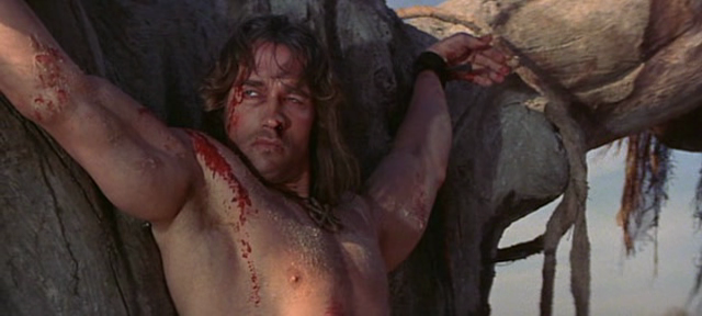 Par la suite, le morceau Wheel of Pain raconte là encore sa propre histoire, traduisant l’ellipse temporelle de nombreuses années par plusieurs changements soudain d’octave dans la mélodie, toujours sur un fond métronomique de marche grave et forcée, exprimant le labeur incessant du héros. Le thème du personnage retentit finalement, quant à lui, au terme du saut temporel. Il s’agit d’un passage remarquablement solennel qui, alors que nombre de réalisateurs et compositeurs auraient opté pour son omission (comme c’est par exemple le cas dans l’horrible version de Marcus Nispel), s’avère être une opportunité en or pour Poledouris d’interpréter la cyclicité des mythes et l’importance de la douleur dans le processus formatif des êtres humains. Son accompagnement d’arrière-plan en cuivres et percussions renvoie d’ailleurs directement aux douloureuses galères de Ben-Hur.