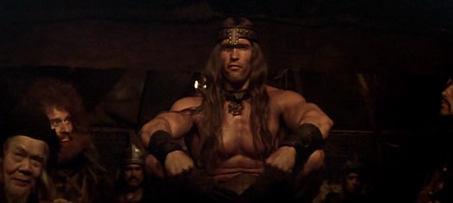 Vient alors la première accalmie. Voilà plus de 17 minutes que le film a commencé lorsque se fait entendre pour la première fois un silence durant plusieurs secondes, et que les dialogues prennent le pas sur l’environnement sonore de l’œuvre (tout du moins musical, les sources de bruit diégétiques demeurant multiples). Il est toutefois intéressant de noter que cette courte pause musicale ne donne lieu à aucun échange verbal significatif, étant donné que les seuls mots prononcés sont un ordre bref commandant à Conan de s’assoir, suivi d’un brouhaha indistinct dans l’arène des gladiateurs. Peut-être vaut-il donc mieux accorder de l’importance à ce court silence qu’à ce qui le remplace : le spectateur vient de terminer son entrée dans l’âge hyborien et a assimilé un condensé intense des années formatives du protagoniste. L’interruption vient donc signaler au public que le premier acte introductif a pris fin.