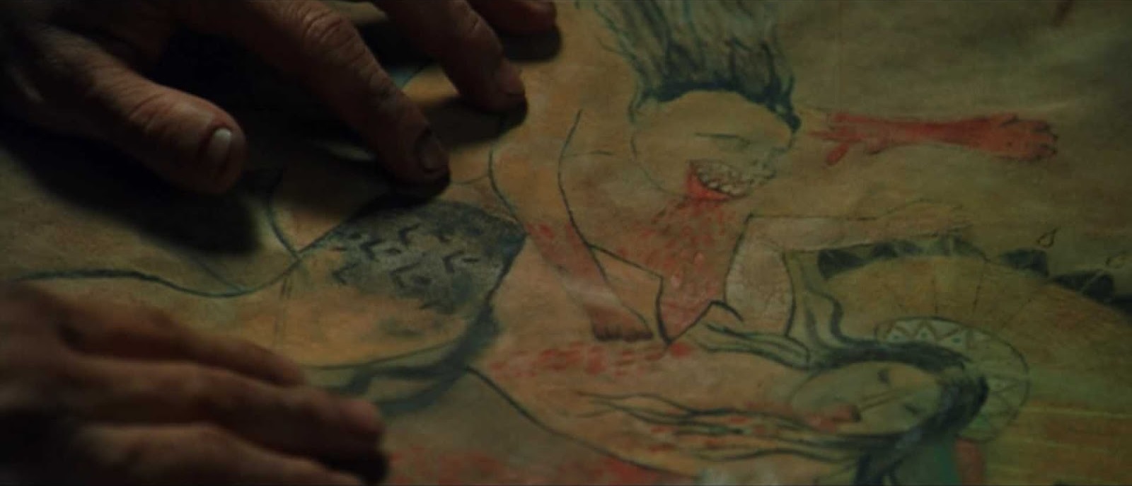 L’ouverture, qui montre un drapeau américain flotter au vent suivi d’une scène de repas durant laquelle des hauts gradés dévorent des steaks sanguinolents, pose très clairement le sujet : le récit traitera de l’Amérique et de la façon dont le pays s’est construit. Plus qu’une simple relecture de l’expédition Donner et de l’affaire Alfred Packer, Ravenous aborde le cannibalisme par un biais mythologique. La présence de deux Amérindiens parmi les personnages (George et Martha) permet de rattacher l’anthropophagie à une ancienne légende algonquienne, selon laquelle l’individu qui se repaît de chair humaine se transforme en wendigo. Créature monstrueuse proche du loup-garou[2], ce dernier est habité par une faim insatiable et absorbe la force des victimes qu’il dévore, devenant plus fort à chaque repas. L’emploi de ce mythe se révèle pertinent non seulement dans sa simple évocation de la culture amérindienne, mais aussi dans ce qu’il symbolise.