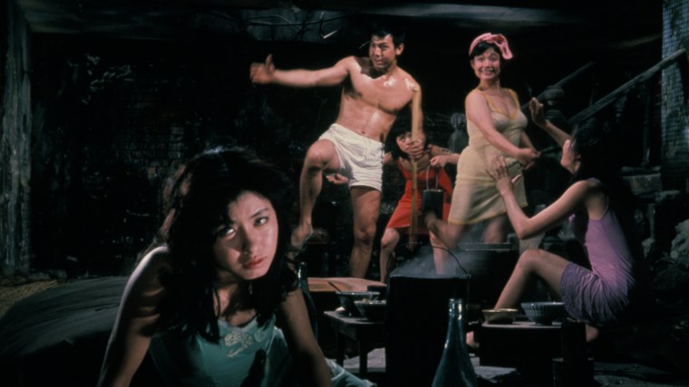 Là encore, le réalisateur cherche des moyens de renouveler subtilement la mise en image d’un scénario préfabriqué. En résultent des plans inhabituels, comme cette splendide vue donnant sur l’extérieur d’une chambre, qui transforme le monde en zone jaunâtre opaque et inhospitalière, tandis que la seule source de couleur chaude demeurant dans notre champ de vision est un rideau violet, signe de la protection du foyer. Une ironie grinçante, étant donné que la scène se concentre sur les pratiques sadiques d’un mari yakuza sur sa femme, qu’il bat pour s’exciter avant de profiter d’elle dans ce désert extérieur. Cet usage symbolique des couleurs reviendra très vite dans la filmographie du réalisateur. On note également l’apparition des plans en contre-plongée à travers un sol transparent, donnant une allure quasiment expressionniste aux scènes, ainsi qu’un long plan jouant sur le décor pour faire apparaître et disparaître des personnages au sein du cadre. Sur la fin du métrage, Suzuki parvient à créer un plan sur deux niveaux, avec le haut du cadre racontant autre chose que la partie inférieure.