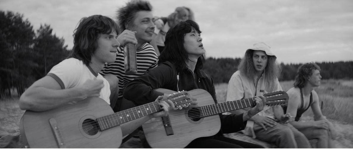 Le temps d’un premier intermède coloré sur « Broken-Hearted Blues » de T. Rex, nous plongeons dans une forêt côtière. Deux jeunes, guitare au dos, avancent vers la mer d’un pas décidé. Ils espèrent taper dans l’œil du chanteur de Zoopark avec leurs chansons. Sur la plage, Mike entonne un Лето (« L’été ») entouré de groupies s’improvisant choristes. De son côté, Nastasia ne semble pas goûter à la mièvrerie ambiante et aux excès d’assurance de son compagnon. Baignée de soleil, révélant un splendide format 2.76:1 qui recrée la largeur de l’Ultra Panavision 70, la séquence marque la première rencontre entre un Mike au sommet de sa gloire et la future icone du rock russe Viktor Tsoi, fondateur du groupe Кино (Kino). Derrière l’apparente insouciance juvénile qui berce la scène, c’est la fin d’une époque qui s’esquisse. À peine arrivée dans le cadre, la figure de Viktor Tsoi (le germano-coréen Teo Yoo, dans son premier rôle majeur) inonde l’image de mélancolie. Mike n’est plus le centre de gravité. Éclaté, le cercle se reforme autour de Viktor et de son acolyte. Les deux illustres inconnus interprètent Мои Друзья (« Mes amis »), une ballade désenchantée au rythme martial qui rompt avec la candeur de la chansonnette estivale que vient de servir Mike. Les regards des amis et admiratrices de ce dernier en disent long. Chacun essaie de mesurer la réaction de la star, cachée derrière ses lunettes de soleil. Mike ne peut que reconnaître le talent des deux néophytes, décomplexant l’assemblée qui demande immédiatement un autre morceau. Et Viktor d’enchaîner sur la complainte entrainante Бездельник (« Glandeurs »). Bienveillant mais pas encore décidé à céder sa place, l’aîné se permet d’interrompre Viktor pour lui suggérer un ajout au refrain. Un tube générationnel est né, entonné et hurlé jusqu’au bout de la nuit autour d’un feu de joie digne de L’eau froide.