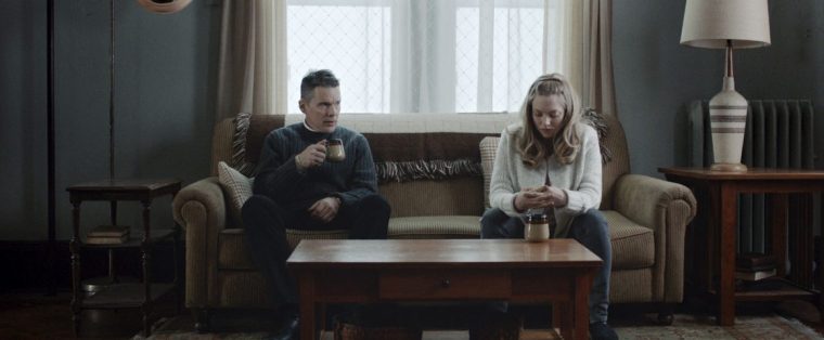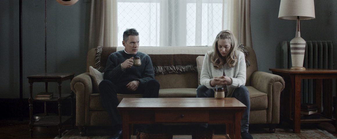 Une petite ville neigeuse moins isolée, mais pas moins apathique, que celle froide d’Affliction. Ernst Toller (Ethan Hawke) est le révérend d’une modeste communauté calviniste dans les hauts de l’état de New York. L’Eglise de First Reformed a essentiellement valeur de halte historico-touristique, ayant été un lieu de passage des chemins de fers clandestins, qui menaient les fuyards du Sud vers leur libération au Nord. En des termes différents, la question de la justice sociale viendra à se poser pour ce pasteur, ainsi que celle de la désobéissance civile. Mary (Amanda Seyfried), nouvelle membre occasionnelle de sa congrégation intercède en la faveur de son compagnon Michael (Philip Etinger), un activiste vert récemment libéré d’une peine de prison. La jeune femme, enceinte, se heurte à la volonté de sa moitié incroyante de ne pas garder l’enfant. En plus de s’inquiéter de son moral, elle souhaite que le pasteur plaide auprès de lui en la défaveur d’un avortement. Le religieux fait la connaissance d’un homme affable, rationnel, quoique montrant des signes visibles de dépression. Celui-ci, ayant dévolu sa vie à la lutte contre le réchauffement climatique, lui présente un argumentaire simple : l’humanité avait selon les estimations jusqu’à 2015 pour, sinon arrêter, du moins freiner dans des mesures impérieuses le processus de réchauffement de la planète et ses conséquences prédictibles. Nous sommes alors en 2017 (année où les États-Unis se retirent des accords de Paris) et rien ou presque n’a été fait. La montée de la température du globe dans des proportions graves pour l’humanité fait le consensus scientifique. Elle est irréversible. Michael énumère les désastres qui peuvent être attendus d’ici 2050 et en conclut qu’il ne veut pas accompagner l’apparition d’une vie humaine dans cet environnement. Que se sentant, au même titre que tout un chacun, indirectement responsable de l’état des choses, il n’ose s’en présenter comme responsable devant le juge que représenterait une nouvelle génération (cette question de la responsabilité pourrait valoir, sur un plan citoyen, dans un temps partagé : le Bangladesh paye désormais pour des décisions prises pour la plupart au Nord). Il formule pour Ernst se qui deviendra sa propre question théologique : Dieu nous pardonnera-t-Il d’avoir détruit notre planète ? Contre la désespérance, appuyée sur des faits, de ce réfractaire, le pasteur répond avec une passion, une véhémence émotive, qui trahissent que cette désespérance est, dans le fond, aussi la sienne. L’homme a perdu un fils en Iraq, après l’avoir en sa qualité d’aumônier militaire encouragé à accomplir un service, ce qui lui a coûté son mariage. Déniaisé d’un patriotisme nourri à l’assurance de compter parmi les élus, il boit plus que de raison quand laissé à lui-même. Il se prend de l’immédiate obsession de sauver ce cadet de son absence d’espoir, quand bien même elle serait un écho inconscient de la sienne… de sa propre rage impuissante face au culte auto-destructeur de la prospérité qu’ont accepté d’autres fidèles, face à ses propres manquements idéologiques passés. Mais, après avoir découvert le matériel explosif que le radical cachait pour un éventuel attentat suicide et n’en avoir rien dénoncé à des autorités supérieures, il est celui qui dénichera bientôt son corps de suicidé, échouant à ce sauvetage.