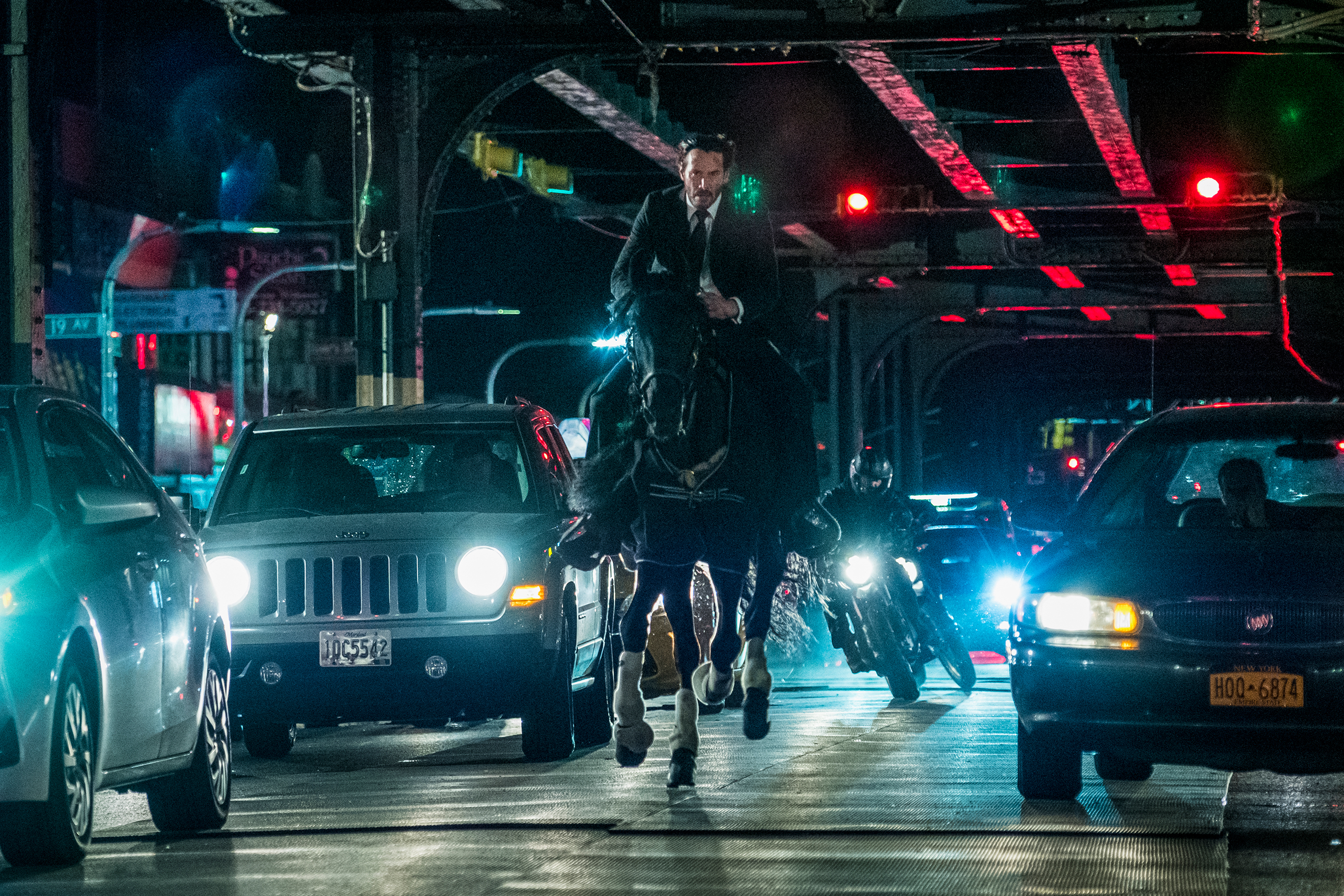 Le soleil se couche sur une paisible soirée new-yorkaise lorsque soudain, la caméra pivote vers la droite pour révéler un monde accablé par le tonnerre et une pluie diluvienne. Le premier plan de John Wick: Chapter 3 – Parabellum passe donc d’une dimension à l’autre, du monde réel et normal à celui de fiction, de cinéma. C’est la façon qu’a le réalisateur de nous inviter à nous replonger dans cet univers parallèle baigné de néons, presque entièrement habité d’assassins et régi par des règles strictes, que le protagoniste a enfreins. Mais au-delà de la promesse d’innombrables balles en plein tête, nuques brisées et combats à l’arme blanche, l’aspect le plus fascinant de cette franchise demeure sa filiation directe à un artisanat se réclamant de Buster Keaton d’une part, et du cinéma hongkongais des années 1980/90 de l’autre, sans rien entre les deux.