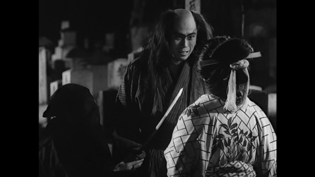 D’habitude dissimulé dans la trame narrative, la fatalité de la tragédie se trouve ici représentée par les kuroko. Ils accompagnent le film sur toute sa longueur et prennent de plus en plus d’importance au fil des scènes. Le spectateur ne sait d’abord pas quoi en penser. Ils dérangent ses habitudes et questionnent sa position d’observateur passif. Puis, plus ils interagissent avec les personnages, plus leur rôle devient clair et signifiant. Personnifier une force si essentielle et insaisissable que peut l’être la destinée est un tour de force, un manifeste esthétique et narratif rare et saisissant. Une méthode qui redéfinit la place de chacun dans les codes de la fiction. Il fallait un cinéaste ambitieux pour prendre ce risque et un grand cinéaste pour en tirer une puissance d’évocation aussi marquante.