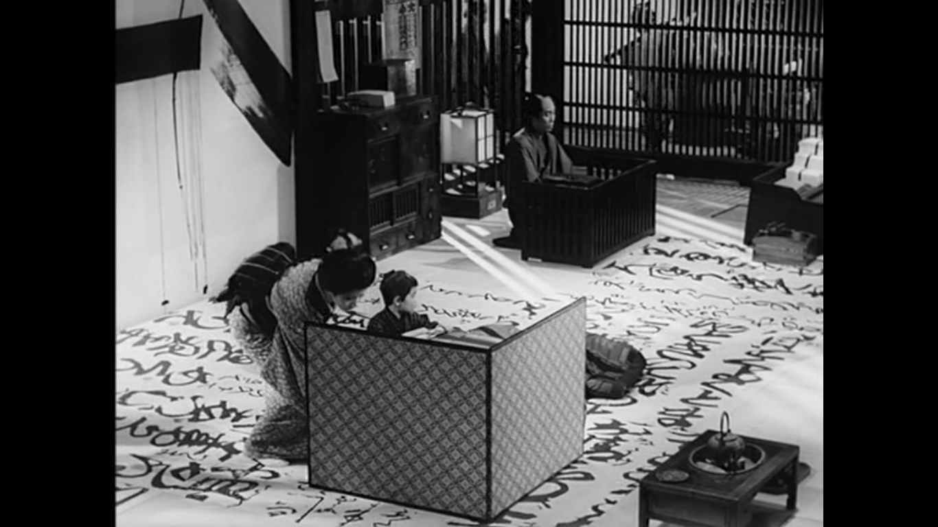 Car ne l’oublions pas, Double Suicide à Amijima est bel et bien du cinéma. Malgré l’importante influence et le recours à certaines règles théâtrales, Shinoda ne tombe pas dans le piège du théâtre filmé. S’il tire le meilleur parti des décors, de l’éclairage, des kuroko et d’autres outils de la scène, il sait les intégrer dans une trame et un langage purement cinématographique (il s’agit quand même de son quinzième film en neuf ans). En témoigne l’utilisation de multiples techniques grammaticales du cinéma (zooms, panos, travellings, gros plans, etc.) qui donne du rythme au récit et contrecarre l’aspect parfois figé que peut avoir le théâtre. L’exemple du deuxième acte est édifiant. Ce dernier se déroule exclusivement dans une maison (divisée visuellement en pièces par des paravents) et ne tourne qu’autour d’un nombre réduit de personnages qui dialoguent (contrairement aux deux autres actes, où les lieux changent et les protagonistes se succèdent). La caméra et la mise en scène sont donc limitées dans un espace donné. Dans cette configuration qu’on pourrait qualifier d’ozu-esque (personnages en cercle, et en seiza, qui discutent), Shinoda donne du rythme à l’intime et au drame. Il construit plus précisément ses plans. Il leur donne de la perspective et joue avec celle-ci (jusqu’à quatre évènements peuvent être montrés en même temps). Il ne laisse que rarement la caméra immobile, mais opère des mouvements lents et enrobants, qui donnent une familiarité à la scène et une place au spectateur dans cette intimité.