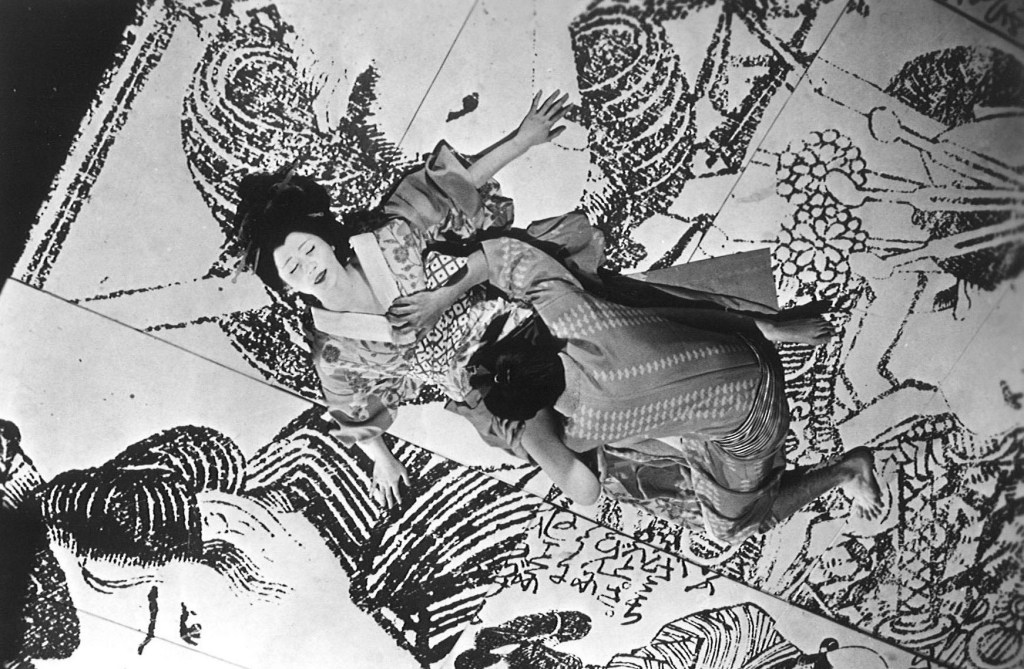 Le théâtre est presque partout. Les décors sont visibles. Ils sont parfois mêmes volontairement incomplets. Murs nus, portes ouvertes sur fonds incertains, traces de peinture encore dégoulinantes, sols aux motifs trop nettement délimités, paravents faisant office de cloisons, fonds de scène obscurs, indiscernables, et une immense porte à rotation centrale, remplaçant les pendrillons et servant de communiquant entre deux scènes. Les éclairages, pour la plupart intradiégétiques, participent eux aussi à cet effet. Ils ne sont pas là pour flatter la photographie du film, mais pour éclairer un espace donné. La lumière est crue, souvent directe, et crée de forts contrastes sur les décors et sur les visages des comédiens. Elle guide le regard des spectateurs sur un endroit précis de la scène ou sur la réaction d’un personnage. La présence de nombreuses ombres portées, conséquence immédiate de cette dureté lumineuse, ajoute à cette impression de vérité visuelle, d’éclairage artificiel naturel. Pas de doute donc, nous sommes sur une scène de théâtre. Shinoda brise sciemment le réalisme cinématographique habituel pour intégrer l’aspect théâtral directement dans la grammaire filmique et non en les dissociant l’un de l’autre.